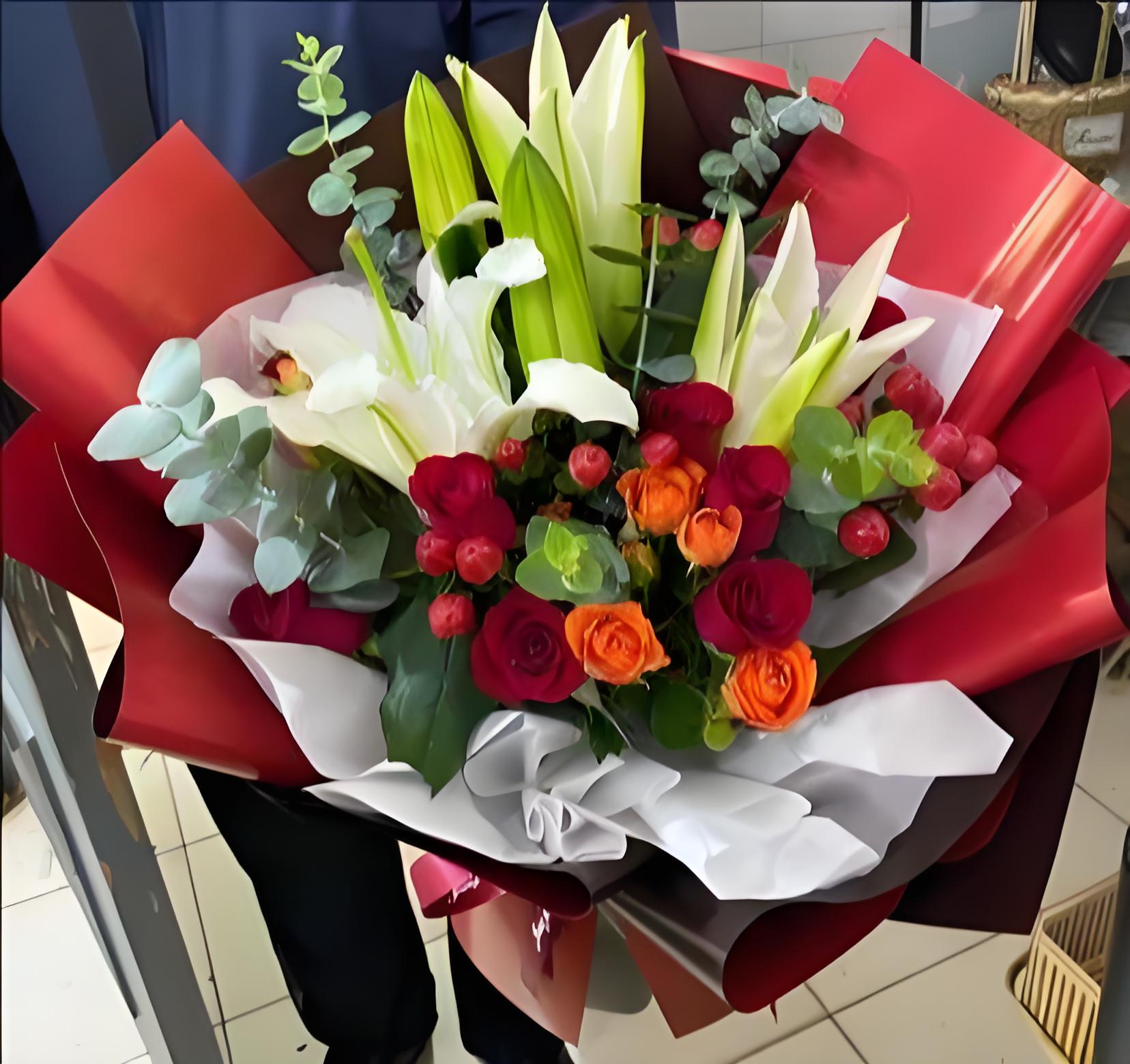 丽水青田县花店包11枝红玫瑰、2枝多头白百合、6枝橙色多头玫瑰、红豆、尤加利叶